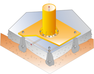 La fijación con una placa intermedia cuadrada es una solución adecuada. La placa base se perfora con un taladro de barrena sacanúcleos con escopleado final de la parte inferior para que, tras el vertido, los anclajes insertados cuenten con un buen anclaje contra extracción.