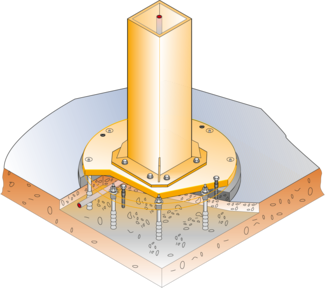 Utilice entonces la fijación clásica de grúas pluma de columna con varillas roscadas de anclaje, que pueden incluirse en la producción de la placa base, cimentadas en un fundamento de hormigón.