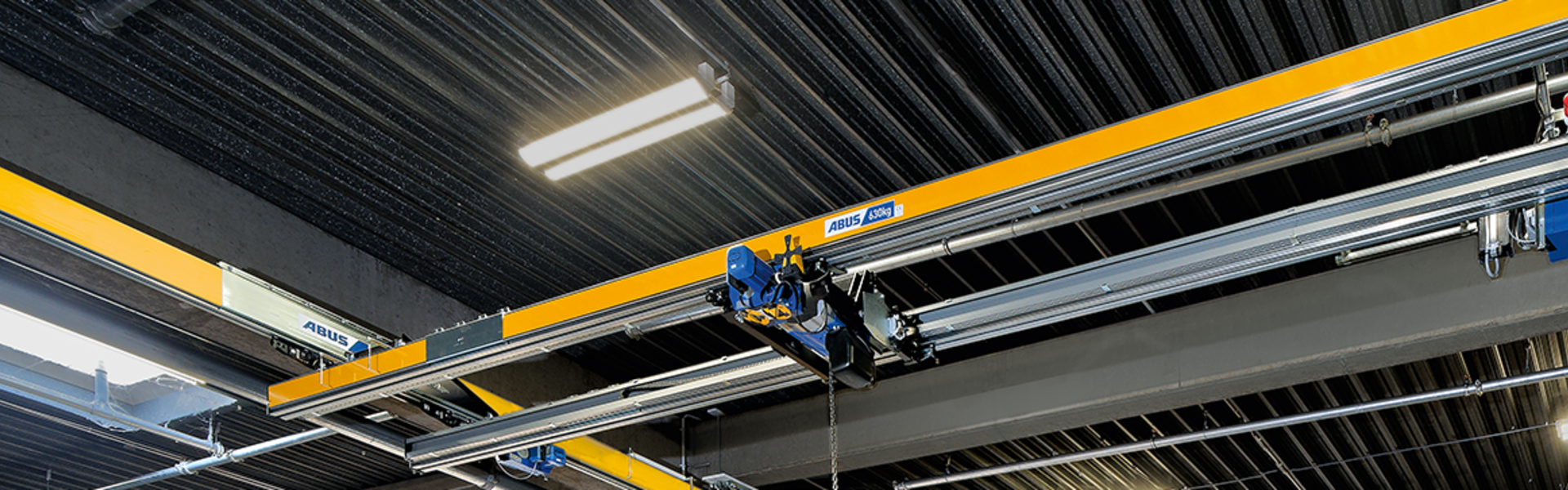 El puente grúa birraíl ZHB de ABUS destaca por sus grandes capacidades de carga y longitudes de la viga puente. Tanto la traslación del carro como la del puente pueden ser eléctricas. El polipasto de cadena está situado entre los carriles, por lo que se alcanza una gran altura de gancho.