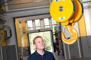 A diferencia del modelo D, el larguero con polipasto se apoya entre los testeros de forma articulada. De este modo se consigue una altura de construcción del carro mínima: un modelo con espacio disponible hacia arriba como variante al modelo DQA también rebajado.