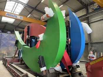 Las monumentales construcciones se entregaron en once segmentos de 8 x 3 metros cada uno en los talleres de Chiarizia y pesaban entre 1,4 y 3,5 toneladas por elemento. Tras el montaje, la instalación total alcanzó una impresionante anchura de 29 metros y una altura de 13 metros.