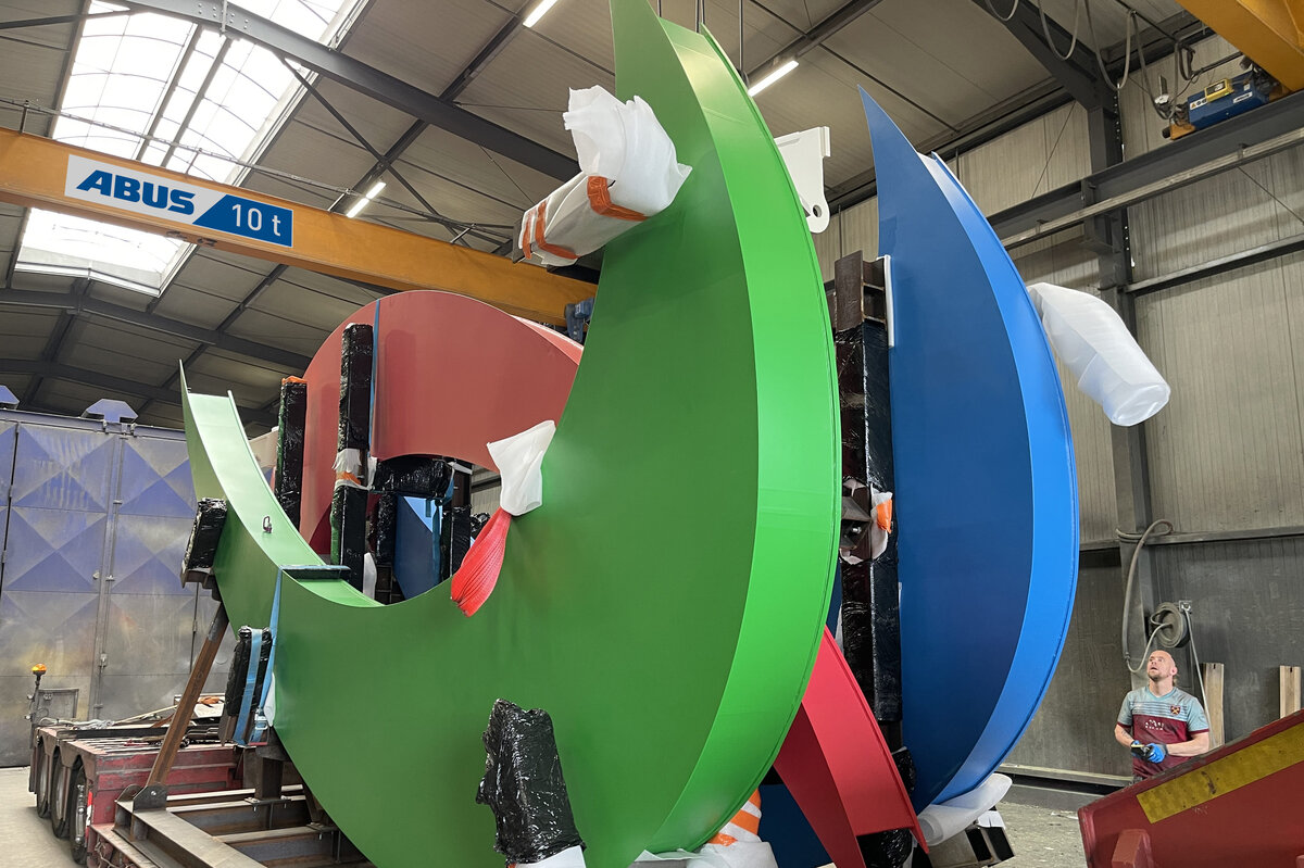 Las monumentales construcciones se entregaron en once segmentos de 8 x 3 metros cada uno en los talleres de Chiarizia y pesaban entre 1,4 y 3,5 toneladas por elemento. Tras el montaje, la instalación total alcanzó una impresionante anchura de 29 metros y una altura de 13 metros.
