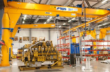 The 19 jib cranes on the lower material flow level ensure that smaller components weighing between two and three tonnes will be moved directly to the work stations of the technical engineers in order to be repaired and tested. The type of jib crane used, VS, features a sturdy steel construction and a solid-web girder with low design and is able to lift loads of up to 6.3 tonnes. Spans have lengths of up to ten metres depending of the SWL. Jib cranes generally are equipped with either ABUS electric chain hoists (loads up to four tonnes) or electric wire rope hoists depending on load capacities, too. All jib cranes at this Pon Equipment repair shop have electric chain hoists as the workpieces that need transporting do not exceed three tonnes.
