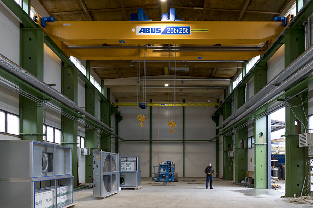 En la primavera de 2017, el Director Gerente de la compañía, Pekka Enne, decidió ampliar las instalaciones de producción a una nueva propiedad donde se centralizará la soldadura de acero inoxidable y los productos de chapa gruesa. La nueva planta de producción requirió 50 t de capacidad de elevación y una altura de elevación de 10 m. Konepaja Enne eligió un puente grúa birraíl ABUS ZLK con dos polipastos de cable con una capacidad de carga de 25 t cada uno. La luz de la grúa es de 13,640 mm.