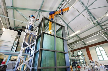 Mirando hacia abajo desde una altura de más de 9 metros vemos una piscina de agua de 5 metros de profundad. Sin embargo, ningún hábil saltador está esperando para mostrar sus virtudes con saltos mortales y giros antes de entrar elegantemente en el agua sin salpicar. Esta gran piscina contiene 12.000 litros de líquido y pesa 17 toneladas, está ubicada en el laboratorio de ingeniería de procesos de la Universidad de Osnabrück (una ciudad en el estado federal de Baja Sajonia, en el noroeste de Alemania), y está más bien destinada a contener módulos de membranas con fines de investigación. Las paredes de cristal de la piscina tienen 4 cm de grosor y, según el profesor Dr. Frank Helmus, director del laboratorio, pueden resistir el impacto de un camión.