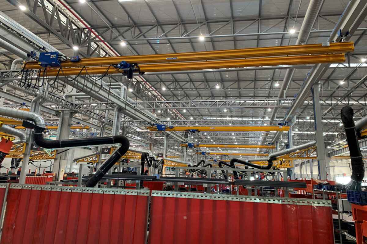 La solución consistió en el suministro de seis puentes grúa monorraíles: dos de estos puentes grúa están equipados con polipastos eléctricos de cable con capacidades de carga de 3.200 kg cada uno y trabajan en tándem (esto significa que un usuario puede operar dos puentes grúa simultáneamente). Otros dos puentes grúa también pueden operarse en tándem, pero tienen mayores capacidades de carga: ambos polipastos de cable pueden elevar cargas de hasta 6.300 kg. En el nivel superior de transporte, donde se mueven las cargas más grandes, hay otros dos puentes grúas monorraíles con capacidad de carga de 3.200 kg cada uno. Sin embargo, estas dos últimas grúas solo funcionan individualmente, es decir, no funcionan en tándem. La logística interna del material se completó con la instalación de veinte sistemas HB para capacidades de carga entre 250 kg y 2.000 kg. El sistema modular de puentes ligeros se utiliza en la producción de São José para transportar e instalar piezas y componentes más pequeños. Así se estableció una línea de producción completa en el proceso de fabricación. Finalmente, una grúa pluma de columna con una capacidad de 250 kg sirve a una estación de trabajo individual. La combinación de varios tipos de grúas ABUS permitió cumplir el objetivo requerido por el cliente de crear un proceso de fabricación dinámico, ajustando la capacidad de carga a la función y lugar de operación de cada grúa.