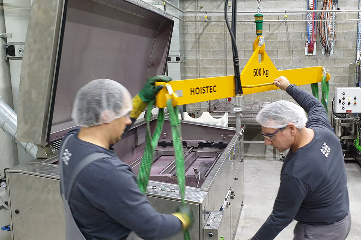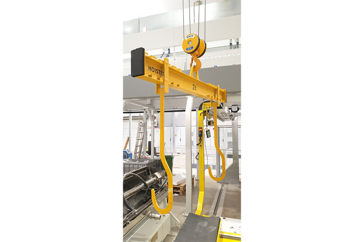 Los puentes grúa transportan las cargas a través de toda la planta, mientras las grúas pluma se utilizan generalmente para tareas específicas en el lugar de trabajo. Las grúas pluma mural, tipo VW se utilizan para limpiar los rodillos de impresión, con la ayuda de una viga transversal.