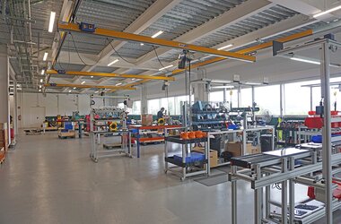 De este modo, para trabajar de una manera más ergonómica y realizar un trabajo más efectivo, se ha optado por la solución que ofrecen los sistemas HB. El sistema de railes suspendidos HB se basa en un diseño modular que puede adaptarse a casi todos los requisitos de espacio, entre otras cosas debido a las diferentes opciones de suspensión y fijación de la grúa. En la zona de montaje, se han instalado un total de 3 puentes EHB, uno para cada estación de trabajo. El sistema se fija directamente a las vigas de perfil laminado del edificio.