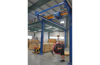 En la zona de carga y descarga de materiales se ha optado por la instalación de un puente grúa ABUS monorraíl tipo ELV de 5 toneladas y 3,5 metros de luz; éste se caracteriza por una construcción de la viga principal de perfil laminado, pudiendo conseguir luces de hasta 18,5 metros. Dicho equipo, incorpora un polipasto eléctrico de cable GM1000 que permite una capacidad de carga de hasta 5 toneladas. Este equipo permite manipular cargas de manera más rápida y eficaz, reduciendo el pasillo y espacio que precisaba una carretilla elevadora. Como resultado de ello, se ha reducido el tiempo invertido para realizar este tipo de trabajo, además del área necesaria para desarrollar esta actividad.